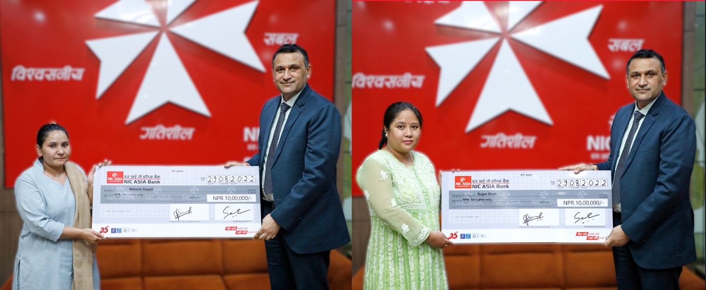 काठमाडौं । एनआईसी एशिया बैंकले सर्वश्रेष्ठ बचत खाता योजना अन्तर्गत बैंकका विभिन्न शाखामा बचत खाता खोलेका दुई जना ग्राहकहरुलाई खातामा उपलब्ध घातक रोग बीमा वापत प्रतिव्यक्ति १० लाख रुपैयाँको दरले कुल २० लाख रुपैयाँ बीमा रकम भुक्तानी गरेको छ । बैंकको नेपालगन्ज शाखामा ‘एम्बेसडर’ श्रेणीको सर्वश्रेष्ठ बचत खाता खोल्नुभएको सुजन शाह र तिनचुली शाखामा सोही खाता खोलेका स्व. महेश कपालीको हिताधिकारीहरुलाई बैंकका नायब प्रमुख कार्यकारी अधिकृत सन्तोष कुमार राठीले उक्त बीमा रकम बराबरको चेक हस्तान्तरण गरे ।