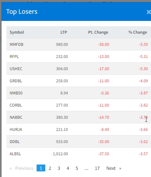 त्यस्तै, रिभर फल्स पावर लिमिटेडको ५।३१, अप्पर सोलु हाइड्रोपावरको ५।३०, ग्रिन डेभलपमेन्ट बैंकको ४।९ र एनएमबि ५० को ३।८७ प्रतिशतले शेयर मूल्य घटेको छ ।