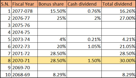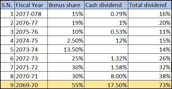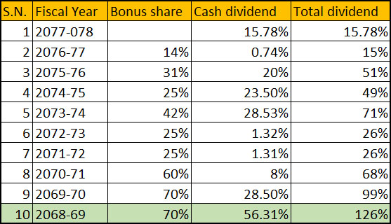 १० वर्षे लाभांश इतिहासमा कम्पनीले सबैभन्दा बढी आर्थिक वर्ष २०७०।७१ मा २८.५० प्रतिशत बोनस शेयर र कर प्रयोजनका लागि १.५० प्रतिशत लाभांश वितरण गरेको थियो ।