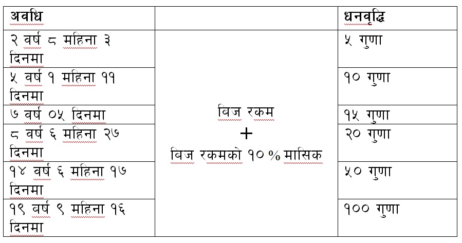 काठमाण्डौ । कुमारी बैंक लिमिटेडले प्रारम्भिक बिज रकमलाई छोटो समयमै पाँचदेखि सयगुणा वृद्धि गर्ने विशेष ‘धनवृद्धि रिकरिङ मुद्दति’ योजना ल्याएको छ। ग्राहकले आफ्नो चाहना तथा भविष्यको आवश्यकताअनुसार न्यूनतम १० हजारदेखि १० लाख रुपैयाँसम्म प्रारम्भिक बिज रकम जम्मा गरी निम्नअनुसारको धनबृद्धि लक्ष्य प्राप्त गर्न सक्ने बैंकले जनाएको छ।
