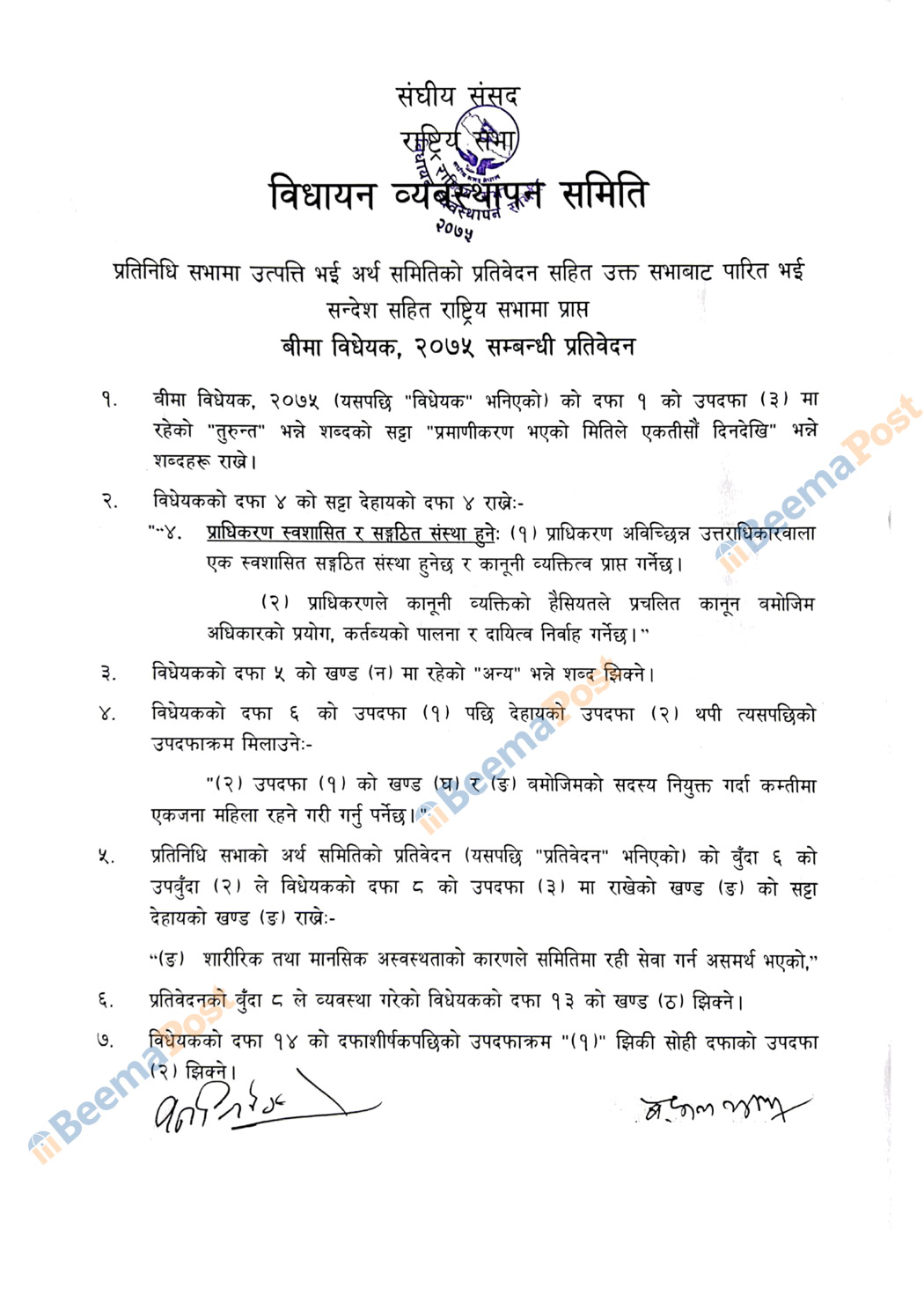 काठमाडौं । राष्ट्रियसभाबाट आज पारित भएको बीमा विधेयक २०७५ माथि विधायन समितिले १९ बुँदे संशोधन पारित गरेको छ । हिजो पारित भएको सो प्रतिवेदन पूर्व तयारी गरी हिजो विहान एक घण्टा लामो बैठकबाट स्वीकृत गरेको तथ्य खुलेको छ ।