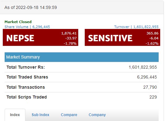 नेप्सेमा सूचीकृत २२९ कम्पनीको ६२ लाख ९६ हजार ४४५ कित्ता शेयर किनबेच हुँदा आज एक अर्ब ६० करोडमाथिको कारोबार भएको छ । त्यस्तै, नेप्सेमा रहेका सबै सूचक आज राताम्य रहेका छन् । सर्वाधिक आज हाइड्रोपावर सूचक ३.०९ प्रतिशतले घटेको छ ।