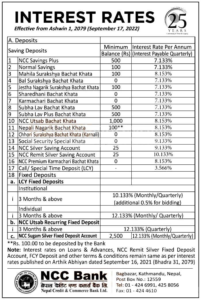 काठमाडौं । नेपाल क्रेडिट एण्ड कमर्स (एनसीसी) बैंक लिमिटेडले भदौ ३१ गते सार्वजनिक गरेको नयाँ ब्याजदर परिवर्तन गरी पुनः सार्वजनिक गरेको छ ।