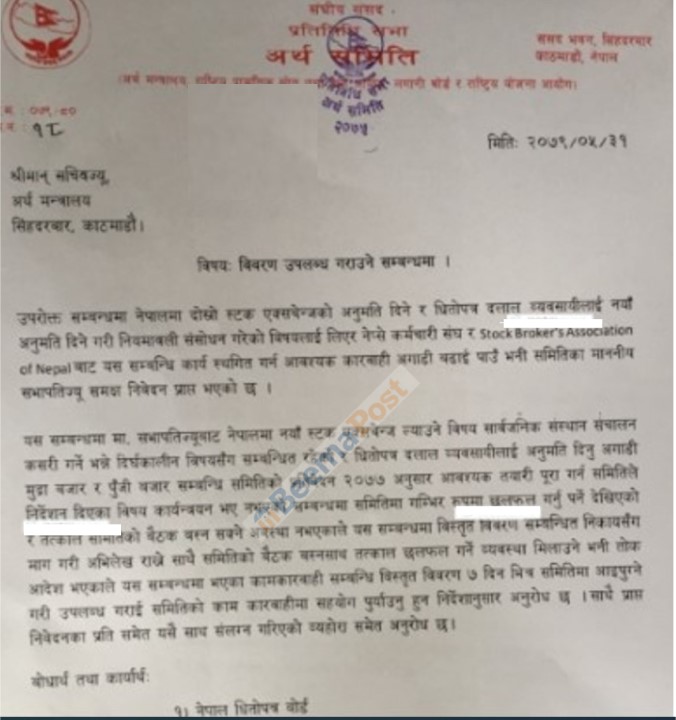 नेपालमा नयाँ स्टक एक्सचेन्ज ल्याउने विषय सार्वजनिक संस्थान संचालन कसरी गर्ने भन्ने दिर्घकालीन विषयसँग सम्बन्धित रहेको र धितोपत्र दलाल व्यवसायीलाई अनुमति दिनु अगाडी मुद्रा बजार र पुँजी बजार सम्बन्धि समितिको प्रतिवेदन २०७७ अनुसार आवश्यक तयारी पूरा गर्न समितिले निर्देशन दिएका विषय कार्यान्वयन भए/नभएको सम्बन्धमा समितिमा गम्भिर रुपमा छलफल गर्नु पर्ने देखिएको पत्रमा उल्लेख छ ।