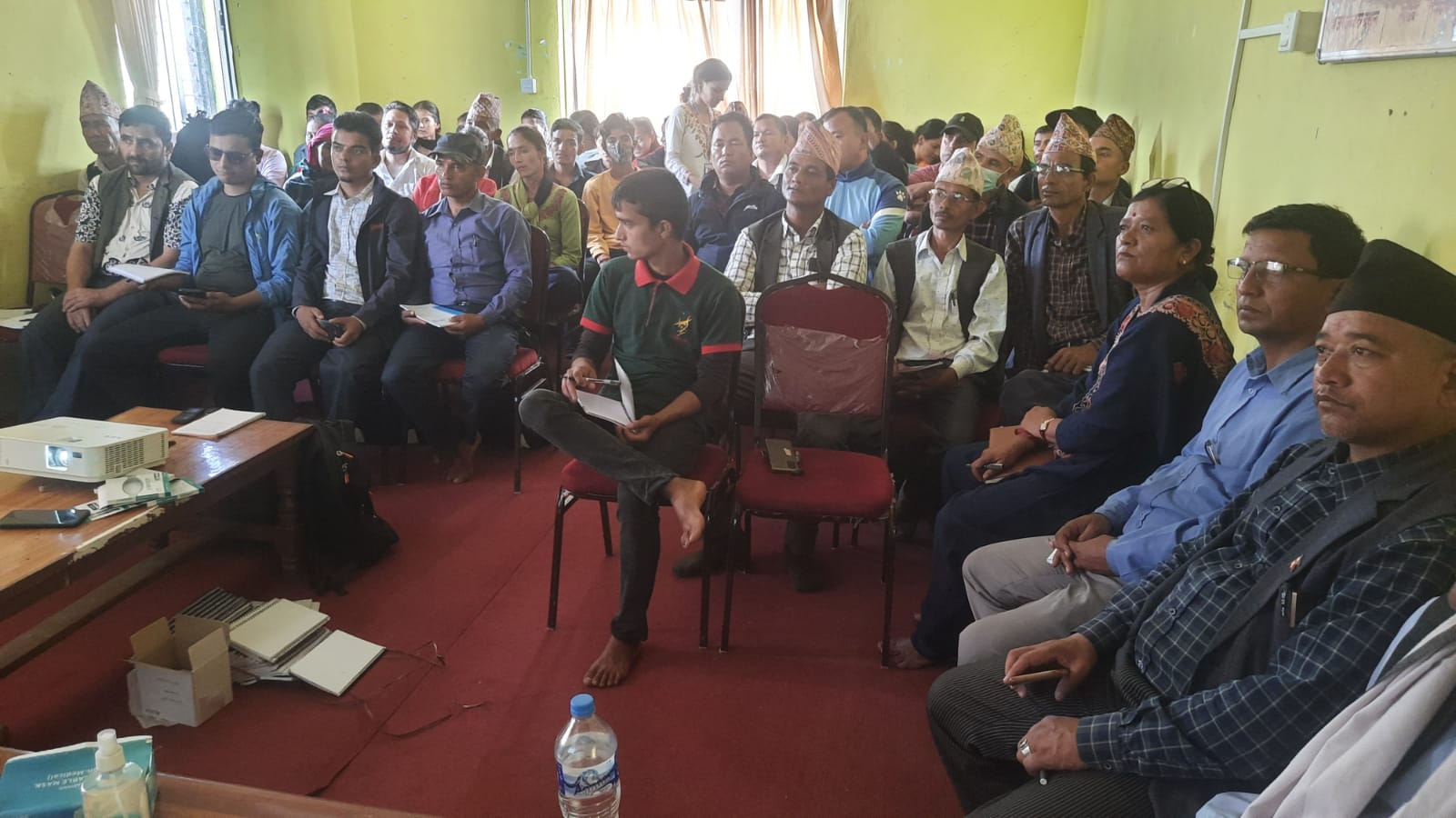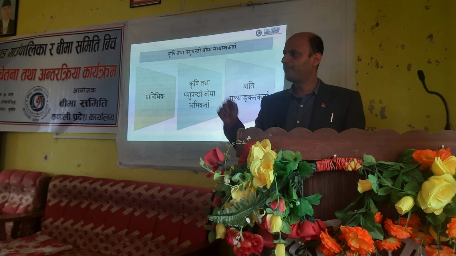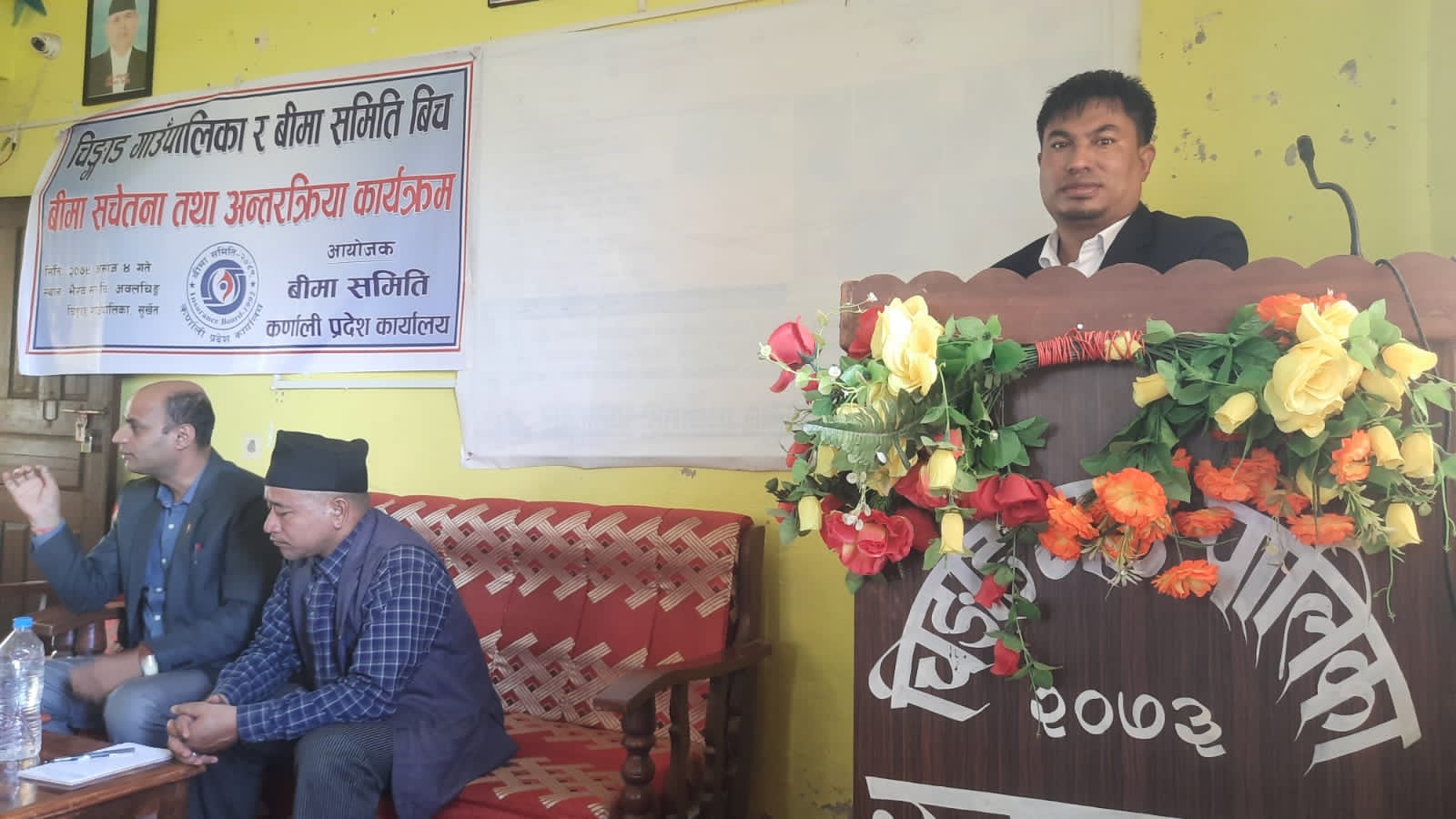 बीमा समितिको कर्णाली प्रदेश कार्यालय प्रमुख उप निर्देशक पदम प्रसाद सोडारीको अध्यक्षतामा आतिथ्यमा गाउपालिकाका अध्यक्ष बोध बिक्रम जिसीको प्रमुख आतिथ्यमा सम्पन्न भएको हो । कार्यक्रममा उपाध्यक्ष मीना कुमारी रोकाया, प्रमुख प्रशासकीय अधिकृत जनकबहादुर हमाल, सबै वडा अध्यक्ष तथा सदस्यहरुको उपस्थितिमा कार्यक्रम सम्पन्न भएको हो ।