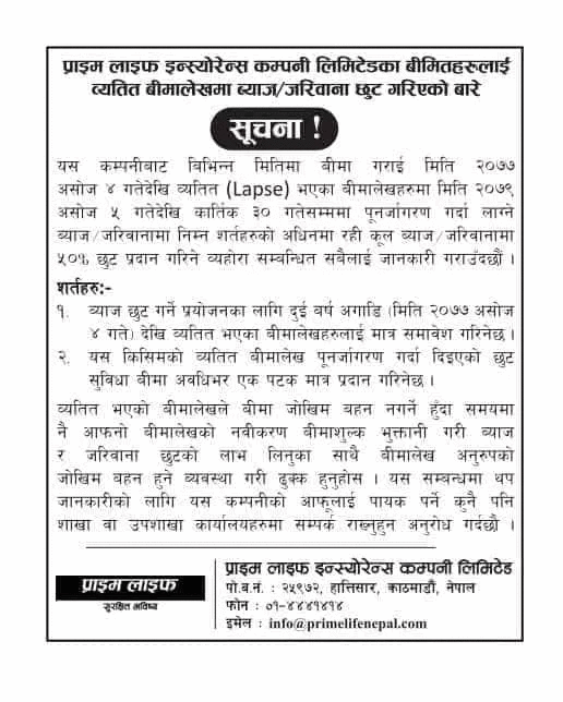 प्राइम लाइफ इन्स्योरेन्सद्धारा व्यतित बीमालेखमा ५० प्रतिशत ब्याज छुट