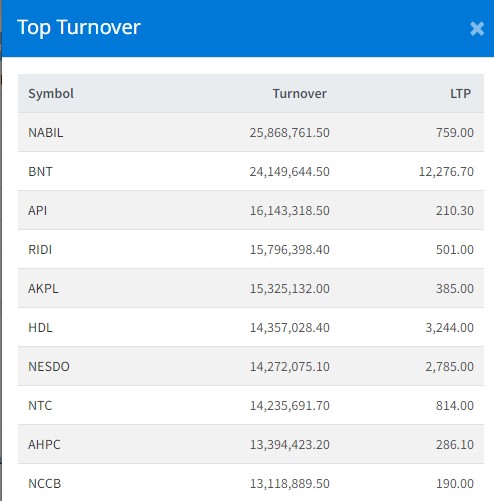 त्यस्तै, बोटलर्स नेपाल (तराई)को २ करोड ४१ लाख, अपि पावरको १ करोड ६१ लाख, रिडी हाइड्रोपावरको १ करोड ५७ लाख र अरुण काबेली पावरको १ करोड ५३ लाख रुपैयँमाथिको कारोबार भएको छ ।