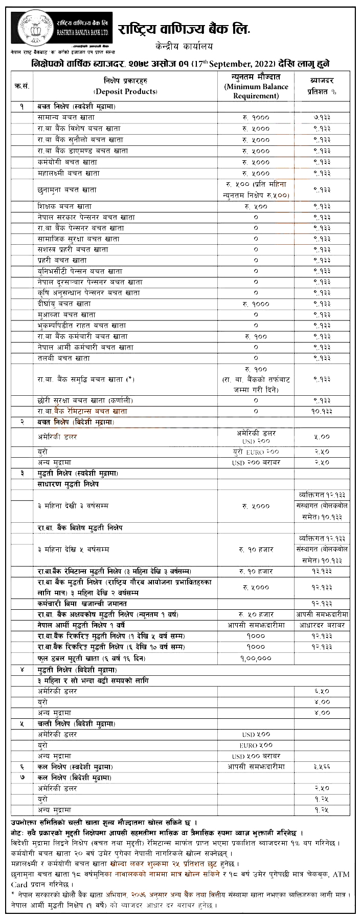 परिमार्जित नयाँ ब्याजदरअनुसार बैंकले बचत खाताअन्तर्गत न्यूनतम ९.१३३ प्रतिशत ब्याजदर र अधिकतम १०.१३३ प्रतिशत ब्याजदर निर्धारण गरेको छ । बैंकले बचत खाताअन्तर्गत राष्ट्रिय बाणिज्य बैंक रेमिटान्स बचत खातामा १०.१३३ प्रतिशत ब्याजदर तोकेको हो ।