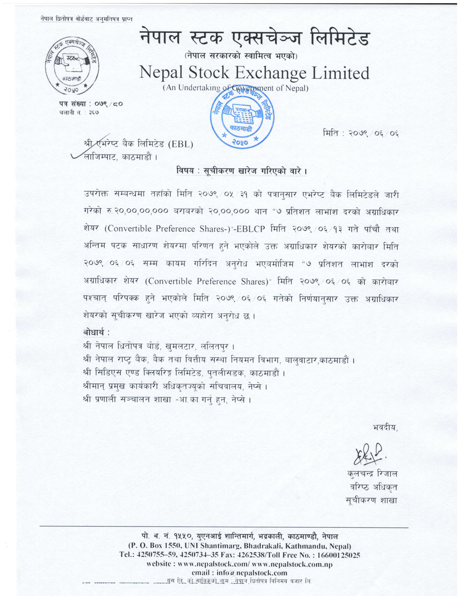 नेप्सेको असोज ६ गतेको निर्णयअनुसार एभरेष्ट बैंकको अग्राधिकार शेयर सूचीकरण ६ गतेदेखि नै खारेज गरिएको हो ।