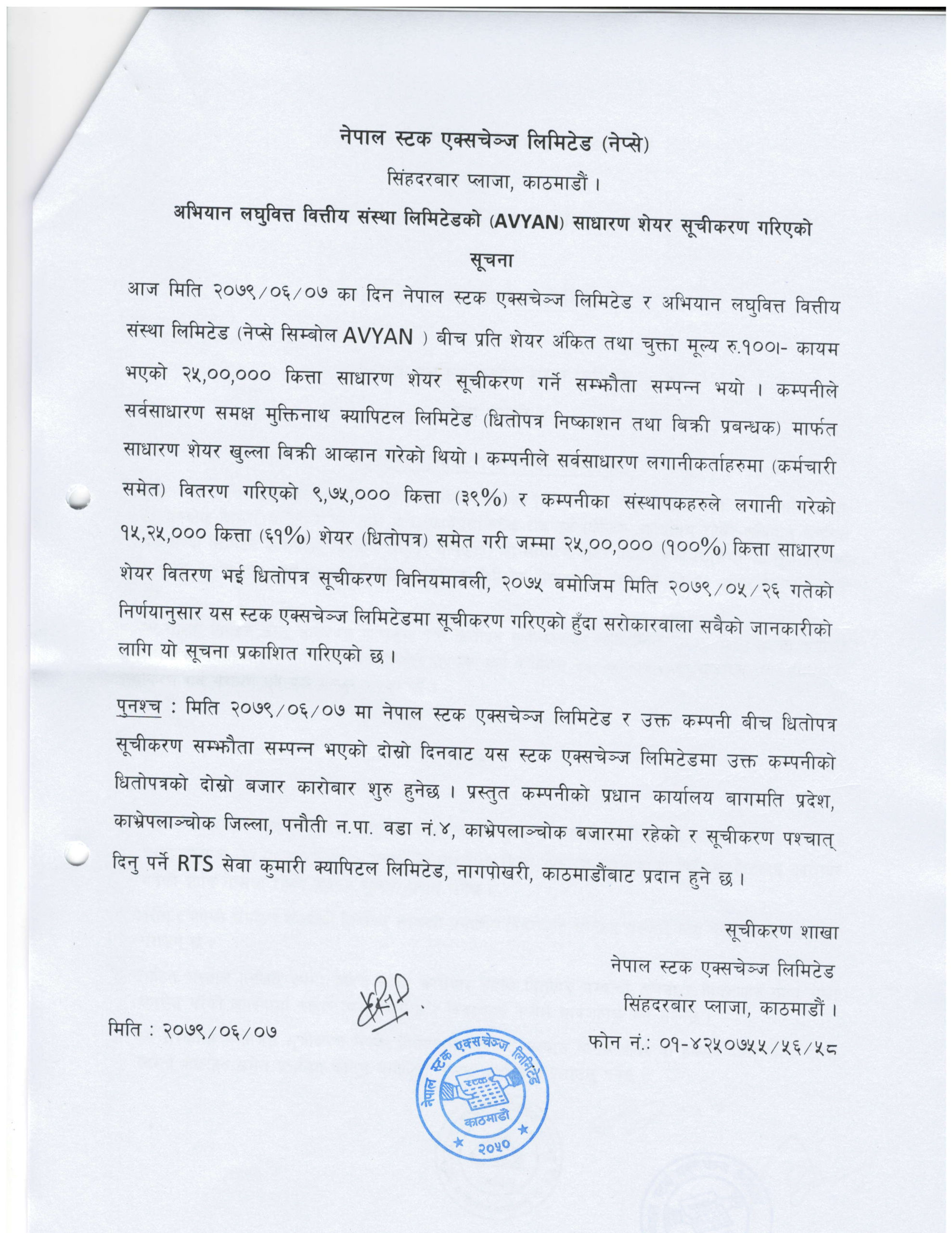 कम्पनीको १०० रुपैयाँ अंकित दरका कुल २५ लाख कित्ता आइपीओ सूचीकृत भएको हो । सूचीकृत पश्चात उक्त शेयर आइतबारबाट धितोपत्र दोस्रो बजारमा कारोबारमा आउनेछ ।
