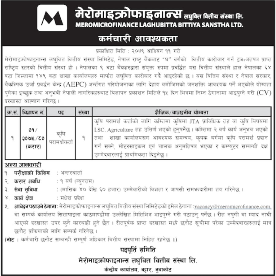 इच्छुक उम्मेदवारले लघुवित्तको वेवसाईट https://www.meromicrofinance.com/ मार्फत आवेदन दिन सक्नेछन् ।