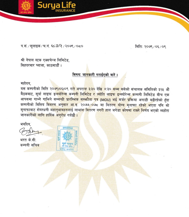 कम्पनीको असोज ९ गते बसेको संचालक समितिको बैठकले हाल कम्पनी र ज्योति लाइफ इन्स्योरेन्स कम्पनी लिमिटेड बीच एक आपसमा गाभ्ने गाभिने सम्बन्धी प्रारम्भिक सम्झौता पत्र भई मर्जर प्रक्रिया अगाडी बढीरहेको हुँदा कम्पनीको वित्तिय विवरण अनुसार आ.व. २०७७/०७८ मा वितरण योग्य मुनाफा रहेको भएता पनि सो मुनाफाबाट शेयरधनी हरुलाई लाभांश वितरण नगरी हाल जगेडा कोषमा राख्ने निर्णय भएको जनाएको छ ।
