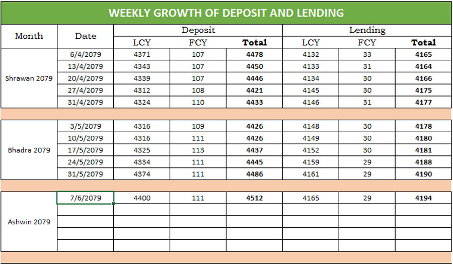 चालु आवको असोज पहिलो सातासम्म बाणिज्य बैंकहरुको कुल निक्षेप ४५ खर्ब १२ अर्ब रुपैयाँ पुगेको छ । अघिल्लो महिनाको अन्तिमसम्म वाणिज्य बैंकहरुको कुल निक्षेप ४४ खर्ब ३३ अर्ब रुपैयाँ रहेको थियो ।