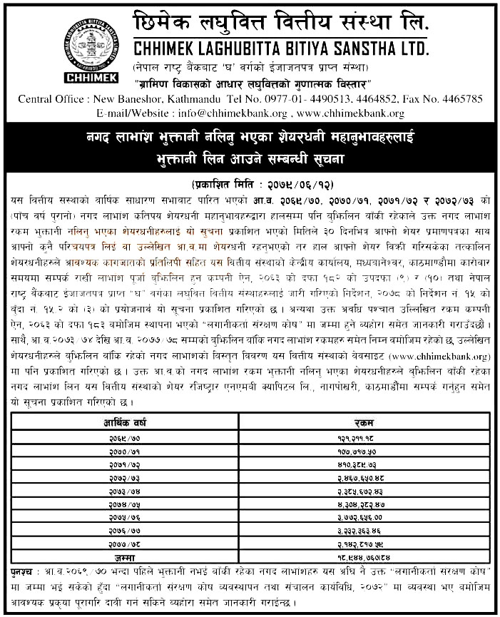 लघुवित्तले आव २०६९।७० देखि २०७२।७३ सम्मको नगद लाभांश ३० दिनभित्र कम्पनीको केन्द्रीय कार्यालय मध्यबानेश्वर, काठमाडौंमा सम्पर्क गर्न आग्रह गरेको छ ।