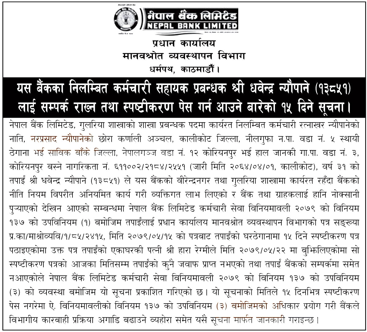 बैंकले एक सूचना प्रकाशित गर्दै बैंकको नीति नियम विपरीत कार्य गरी व्यक्तिगत लाभ लिएको देखिन आएको सम्बन्धमा कालीकोट जिल्ला, नीलगुफा नगरपालिका वडा नं. ५ का धवेन्द्र न्यौपानेसँग १५ दिनभित्र स्पष्टीकरण पेश गर्न भनेको हो ।