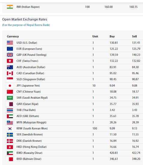 त्यस्तै, १ युरोपियन युुरो डलरको नेपाली बजारमा १२५ रुपैयाँ २२ मा खरिद भईरहेको छ भने १२५ रुपैयाँ ७९ पैसामा विक्री भईरहेको छ । युके पाउन्डलाई १३९ रुपैयाँ ५९ पैसामा खरिद र १४० रुपैयाँ २३ पैसामा बिक्रि भईरहेको छ ।