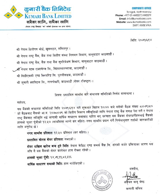 प्रस्तावित लाभांश नियामक नेपाल राष्ट्र बैंकको स्वीकृतिपछि वार्षिक साधारण सभामा पारित भएपछि मात्र वितरण हुने बैंकले जनाएको छ । कुमारीले हाल कायम १४ अर्ब ७१ करोड ११ लाख रुपैयाँबाट यो नगद लाभांश प्रस्ताव गरेको हो ।