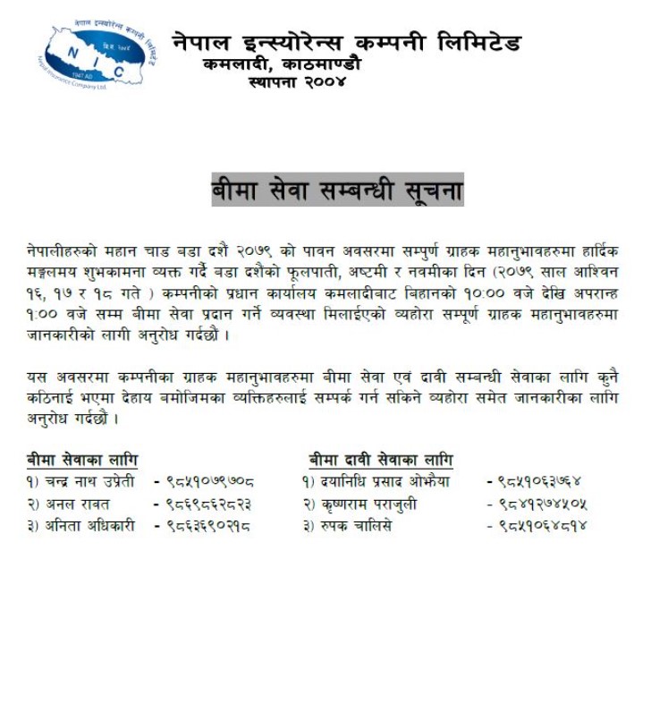 नेपाल इन्स्योरेन्स कम्पनीले दशैं विदामा पनि बीमा सेवा सुचारु गर्ने