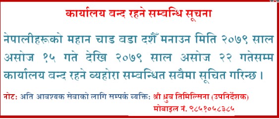 उक्त समयमा बीमा समितिसँग सम्बन्धित कुनै पनि व्यक्ती वा संस्थाको अतिआवश्यक काम परेमा समितिका उपनिर्देशक ध्रुव तिमिल्सिनालाई सम्पर्क गर्न आग्रह गरेको छ ।