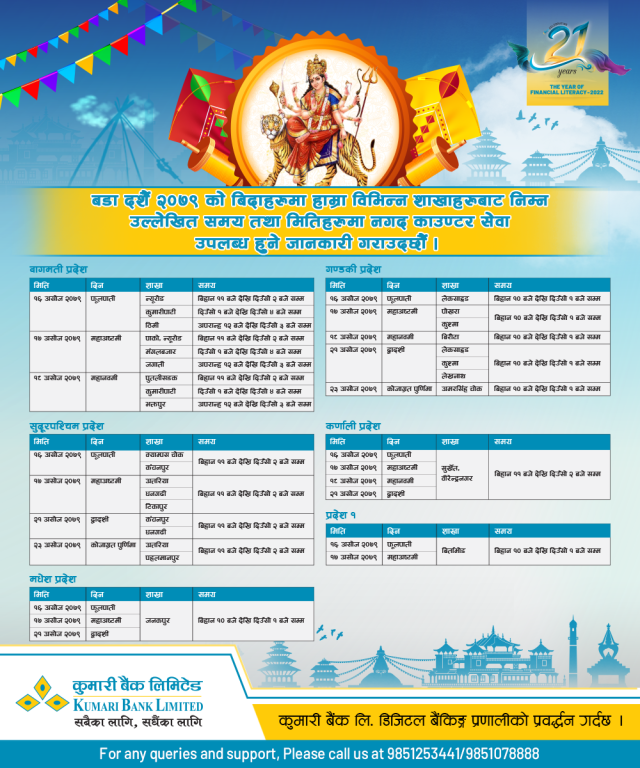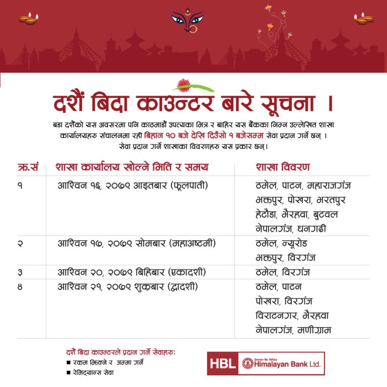 काठमाडौं। दशैंको बिदामा पनि बैंकहरुले बैंकिङ सेवा दिने भएका छन्। दशैंको ५ दिन लामो बिदा सुरु भईसकेको छ ।पछिल्लो समय डिजिटल कारोबार बढेपनि बैंकहरुले दशैंको बिदाको समयमा केही शाखाहरु ३ देखि ४ घण्टासम्मको लागि खोल्नेछन् ।