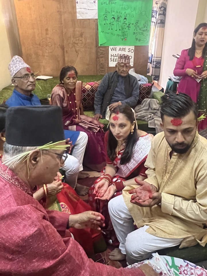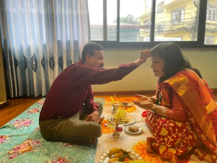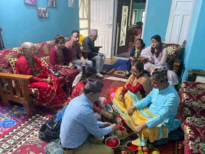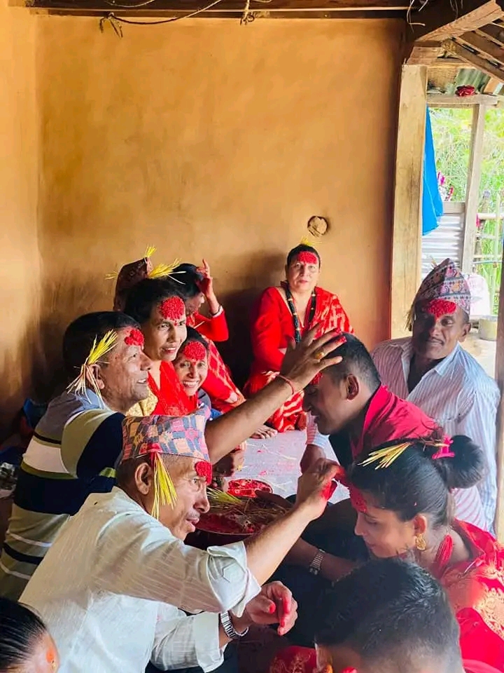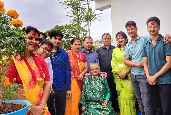 बीमा समितिका उपनिर्देशक निशा घिमिरे परिवारको साथमा टिका ग्रहण गर्दै