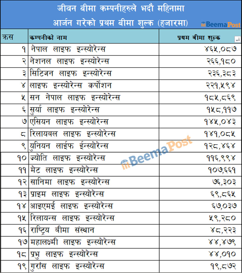 सो मध्ये सबैभन्दा बढी नेपाल लाइफ इन्स्योरेन्सले ४६ करोड ५० लाख ८७ हजार रुपैयाँ प्रथम बीमाशुल्क आर्जन गरी आफ्नो अग्रता कायम गर्न सफल भएको छ । यसका साथै बीमा ब्यवसायमा उल्लेख्य सुधार गर्दै नेशनल लाइफ इन्स्योरेन्सले पनि भदौ महिनामा २६ करोड ६१ लाख ८० हजार रुपैयाँ प्रथम बीमाशुल्क आर्जन गरेको छ ।