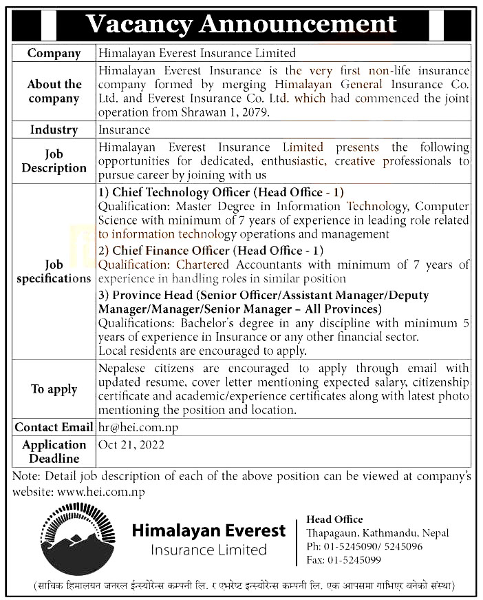 हिमायलन एभरेष्ट इन्स्योरेन्सले माग्यो सातै प्रदेशबाट प्रोभिन्स हेड, कति चाहिन्छ शैक्षिक योग्यता ?