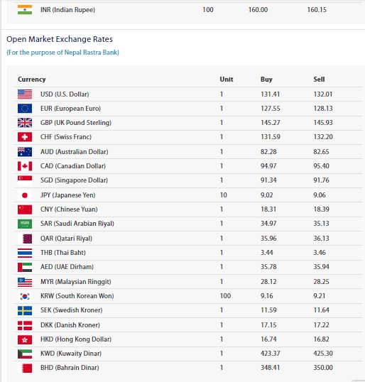 त्यस्तै, १ युरोपियन युुरो डलरको नेपाली बजारमा १२७ रुपैयाँ ५५ मा खरिद भईरहेको छ भने १२८ रुपैयाँ १३ पैसामा विक्री भईरहेको छ । युके पाउन्डलाई १४५ रुपैयाँ २७ पैसामा खरिद र १४५ रुपैयाँ ९३ पैसामा बिक्रि भईरहेको छ ।