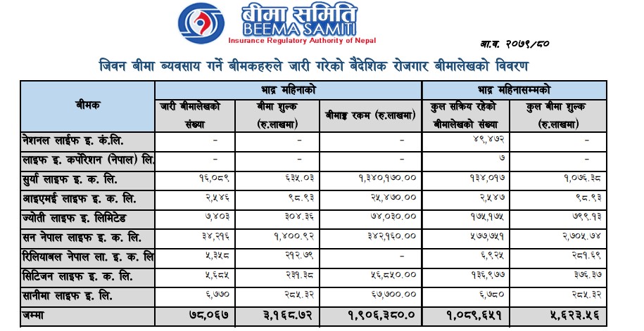 बीमा समितिको तथ्यांक अनुसार सुर्या लाइफले १० करोड ७३ लाख रुपैयाँ बराबरको वैदेशिक रोजगार बीमाशुल्क संकलन गरेको छ । ज्योति लाइफले ७ करोड ९९ लाख, सिटिजनले ३ करोड ७६ लाख, सानिमा लाइफले २ करोड ८५ लाख, रिलायबल लाइफले २ करोड ८१ लाख र आइएमई लाइफले ९८ लाख रुपैयाँ बराबरको सो प्रकारको बीमाशुल्क उठाएका छन् ।