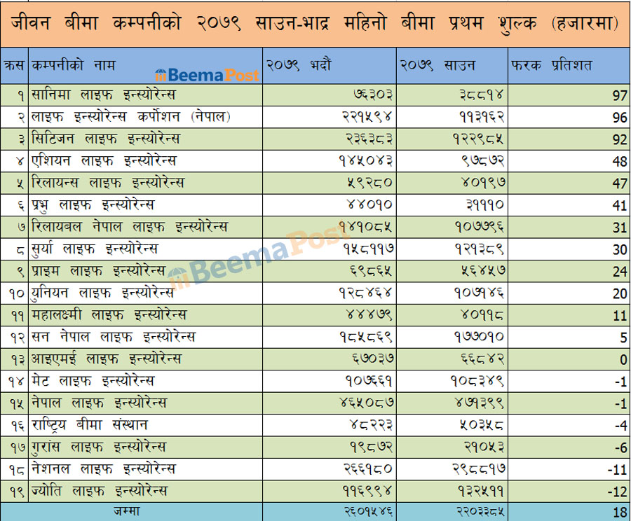 भाद्र महिनामा प्रथम बीमा शुल्क २८ प्रतिशतले बढ्यो, सानिमा, एलआइसी नेपाल र सिटिजन लाइफ उत्कृष्ट कसको अवस्था कस्तो ? (सूचीसहित)