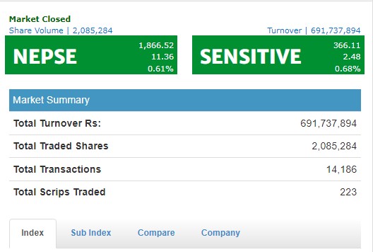 आज नेप्से परिसूचक ११.३६अंकले बढेर १८६६ को विन्दुमा कायम हुन पुगेको छ । नेप्सेमा सूचीकृत २२३ कम्पनीको २० लाख ८५ हजार २८४ कित्ता शेयर किनबेच हुँदा ६९ करोड १७ लाख ३७ हजार रुपैयाँको कारोबार भएको छ ।