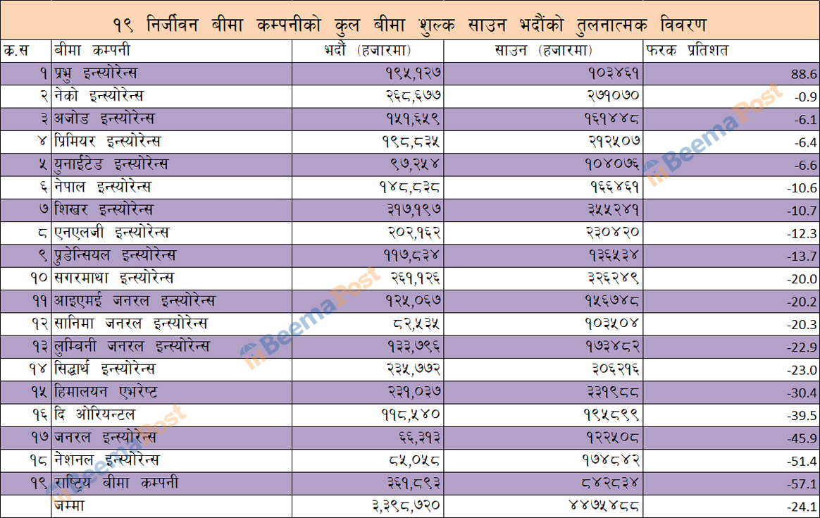 भदौं महिनामा १८ निर्जीवन बीमा कम्पनीको व्यवसाय २४% ले घट्यो, प्रभु एक्लैको बृद्धि, सगरमाथा र हिमालयन एभरेष्टको व्यवसाय खस्कियो
