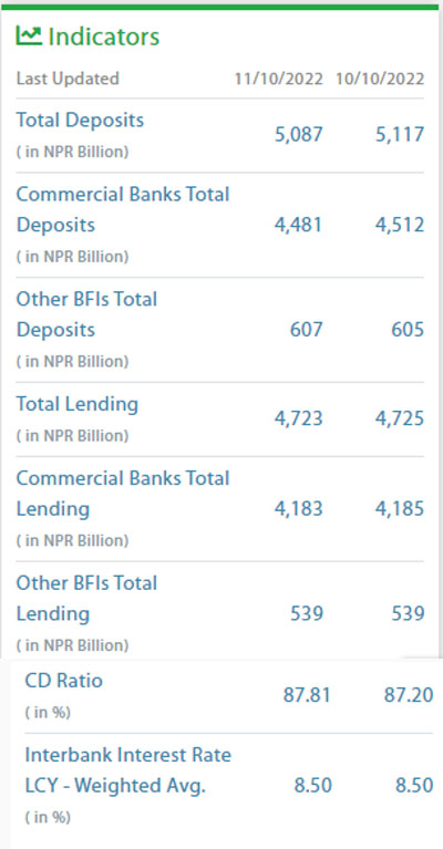 राष्ट्र बैंकका अनुसार असोज २४ गतेसम्म बैंक तथा वित्तीय संस्थाहरुको कुल निक्षेप ५१ खर्ब १७ अर्ब रुपैयाँ रहेकोमा एकैदिनमा घटेर असोज २५ गतेसम्ममा ५० खर्ब ८७ अर्ब रुपैयाँ पुगेको छ ।