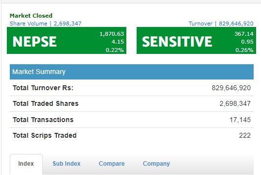नेप्सेमा सूचीकृत २२२ कम्पनीको २६ लाख ९८ हजार ३४७ कित्ता शेयर किनबेच हुँदा ८२ करोड ९६ लाख रुपैयाँमाथिको कारोबार भएको छ । तुलनात्मक रुपमा आज कारोबार रकम पनि केही माथि उचालिएको छ ।
