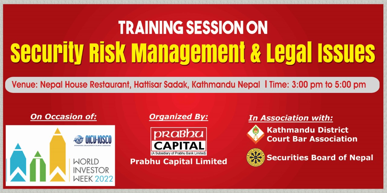 काठमाडौं । विश्व लगानीकर्ता सप्ताह–२०२२ को अवसरमा प्रभु क्यापिटल लिमिटेडद्वारा नेपाल धितोपत्र बोर्ड तथा काठमाडौं जिल्ला अदालत बार एशोसिएशनकोे समन्वयमा जिल्ला अदालत बार एशोसिएसनको कार्यसमिति तथा अन्य सदस्य अधिवक्ताहरुलाई १ दिने तालिम कार्यक्रम काठमाडौंमा सम्पन्न गरेको छ । कार्यक्रम नेपाल हाउस रेष्टुरेन्ट, हात्तीसार, काठमाडौंमा २०७९ असोज २८ गते शुक्रबार सम्पन्न भएको हो ।