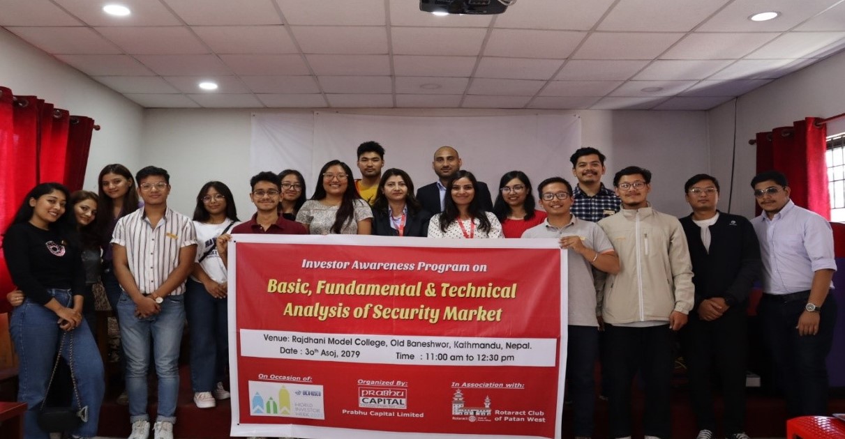 काठमाडौं । विश्व लगानीकर्ता सप्ताह – २०२२ को अवसरमा विविध लगानीकर्ता सचेतना अभिवृद्धि गर्ने उद्देश्यले प्रभु क्यापिटल लिमिटेडले रोटर्याक्ट क्लब अफ पाटन वेस्टका सदस्यहरुका लागि शेयर बजार सम्बन्धी बेसिक फण्डामेन्टल एण्ड टेक्नीकल एनालाईसिस अफ सेक्युुरिटी मार्केट बिषयमा १ दिने प्रशिक्षण कार्यक्रम काठमाडौंमा सम्पन्न गरेको छ । कार्यक्रम राजधानी मोडेल कलेज, पुरानो बानेश्वर, काठमाडौंमा २०७९ असोज ३० गते आईतबार सम्पन्न भएको हो ।