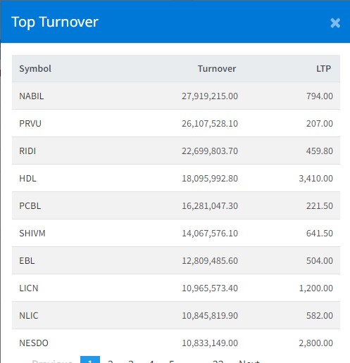 त्यस्तै, प्रभु बैंकको २ करोड ६१ लाख र रिडी हाइड्रोपावरको २ करोड २६ लाख, हिमालयन डिस्टिलरीको १ करोड ८० लाख र प्राइम कमर्सियल बैंकको १ करोड ६२ लाख रुपैयाँमाथिको कारोबार भएको छ ।