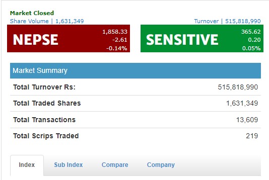 आज नेप्सेमा सूचीकृत २१९ कम्पनीको १६ लाख ३१ हजार ३४९ कित्ता शेयर किनबेच हुँदा ५१ करोड ५८ लाख रुपैयाँमाथिको कारोबा भएको छ । त्यस्तै, नेप्सेमा रहेका १३ उपसूचकमध्ये आज निर्जिवन बीमा, म्युचुअल फण्ड, बैकिङ्ग, ब्यापार, होटल तथा पर्यटन र अन्य समूह बढेको छ भने बाँकी अन्य सूचक सबै राताम्य रहेका छन् ।