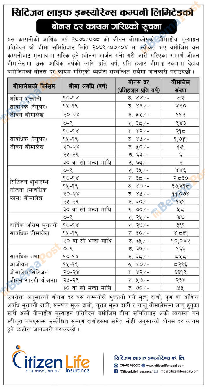आज प्रकाशित नयाँ बोनस दर अनुसार सावधिक तथा आजीवन बीमालेख (सिटिजन जीवन सारथी योजना) मा ९ वर्षसम्मका पोलिसीले ३७ रुपैयाँ, १० देखि १४ वर्षका पोलिसीहरुले ३८ रुपैयाँ, १५ देखि १९ वर्षसम्मका पोलिसीहरुले ४० रुपैयाँ, २० देखि २४ वर्षसम्मका पोलिसीहरुले ४२ रुपैयाँ, २५ देखि २९ वर्षसम्मका पोलिसीहरुले ५७ रुपैयाँ र ३० वर्ष सो भन्दा माथिका पोलिसीहरुले ७० रुपैयाँ प्रति वर्ष प्रति हजारका दरले बोनस पाउनेछन् ।