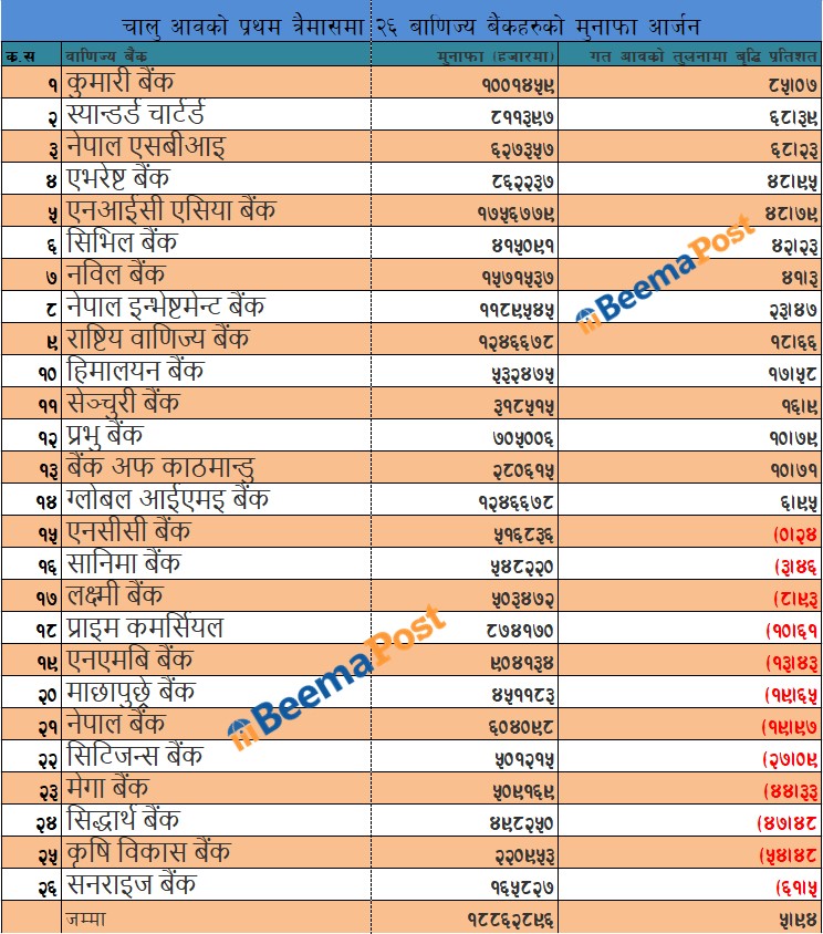 पहिलो त्रैमासको अवधिसम्ममा वाणिज्य बैंकहरुले सार्वजनिक गरेको वित्तिय विवरणको आधारमा हेर्दा अघिल्लो आर्थिक बर्षको तुलनमा १२ वाणिज्य बैंकहरुको मुनाफा घटेको छ । सो मध्ये कृषि विकास बैंक, एनएमबी बैंक, सिद्धार्थ बैंक, सिटिजन्स बैंक, सनराईज बैंकको मुनाफा उच्च अंकले गिरावट आएको छ ।