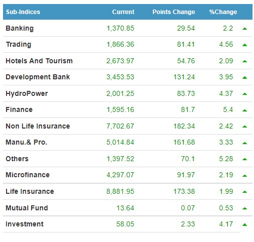 त्यस्तै, नेप्सेमा रहेका सबै उपसूचकमा आज हरियाली छाएको छ । सर्वाधिक आज अन्य सूचक ५.२८ प्रतिशत र हाइड्रोपावर सूचक ४.३७ प्रतिशतले बढेको छ ।