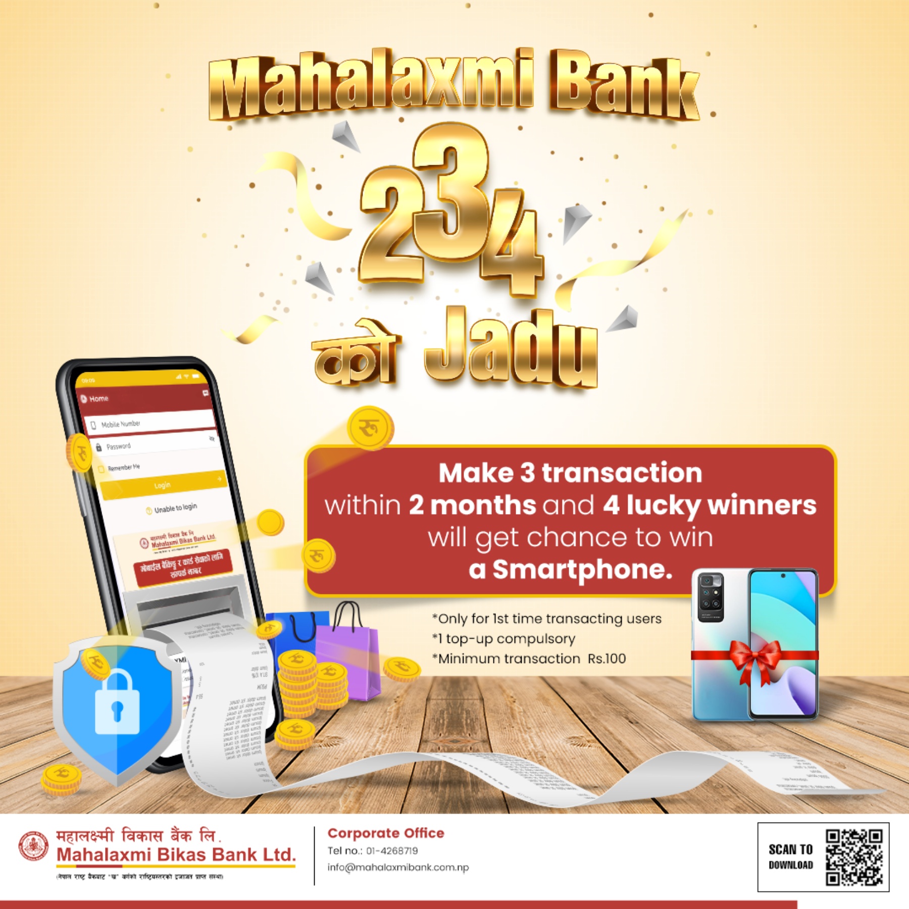 यस योजना अन्तर्गत महालक्ष्मी मोबाईल एप प्रयोग गरी दुई महिनासम्म तीन वटा कारोबार गर्ने ग्राहकहरु मध्ये भाग्यशाली चार ग्राहकहरुले स्मार्ट फोन प्राप्त गर्न सक्नेछन् । बैंकले यस योजना हालसम्म महालक्ष्मी मोबाईल एप प्रयोग नगरेका ग्राहकहरुलाई लक्षित गर्दै नोभेम्बर १, २०२२ देखी डिसेम्बर ३१, २०२२ सम्म सञ्चालन गर्न लागेको हो । ग्राहकले दुई महिनासम्म तीन वटा कारोबार गर्दा कारोबार रकम न्यूनतम रु.एक सय वा सो भन्दा माथि साथै कम्तीमा पनि एउटा कारोबार मोबाईल टपअपको हुनुपर्ने बैंकले जनाएको छ ।