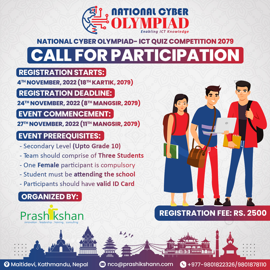 मंसिर ११ गते देखि सुरु हुने यस कार्यक्रममा काठमाडौं उपत्यकाका ५० भन्दा बढि स्कूलका टिमहरुले प्रतिस्पर्धा गर्नेछन् । नेशनल साईबर ओलम्पियाड सुचना प्रविधि क्षेत्रको अन्तर विद्यालय हाजिरी जवाफ प्रतियोगिता हुने छ जसमा सहभागी हुने स्कूलहरुले मंसिरको ८ गते सम्ममा दर्ता गर्नुपर्ने छ ।