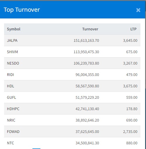 सर्वाधिक जाल्पा सामुदायिक लघुवित्तको १५ करोड १६ लाख रुपैयाँमाथिको कारोबार भएको छ । त्यस्तै, शिवम् सिमेन्ट्सको ११ करोड ३९ लाख, नेष्डो समृद्ध लघुवित्तको १० करोड ६२ लाख, रिडी हाइड्रोपावरको ९ करोड ६० लाख र हिमालयन डिस्टिलरीको ५ करोड ८५ लाख रुपैयाँमाथिको कारोबार भएको छ ।