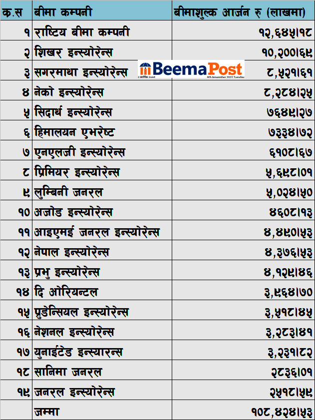 बीमा समितिको तथ्यांक अनुसार नेको इन्स्योरेन्स कम्पनीले ८२ करोड रुपैया, सिद्धार्थ इन्स्योरेन्सले ७६ करोड रुपैयाँ, हिमालयन एभरेष्टले ७३ करोड रुपैयाँ, एनएलजी इन्स्योरेन्सले ६१ करोड रुपैयाँ, प्रिमियर इन्स्योरेन्सले ५६ करोड रुपैयाँ, लुम्बिनी जनरल इन्स्योरेन्सले ५० करोड रुपैयाँ , अजोड इन्स्योरेन्सले ४६ करोड रुपैयाँ र आइएमई जनरलले ४४ करोड रुपैयाँ कुल बीमाशुल्क आर्जन गर्न सफल भएका छन् ।