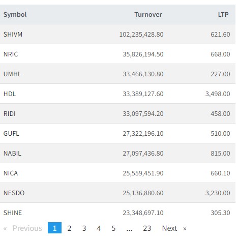 त्यस्तै, नेपाल रि, युनाईटेड मोदी, हिमालयन डिस्टीलरी, रिदि पावर पार्टनर, गुर्खाज फाइनान्स, नबिल बैंक, एनआईसी एशिया बैं)क, नेष्डो र शाईन रेसुगांको सर्वाधिक कारोबार भएको छ।