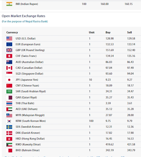त्यस्तै, १ युरोपियन युुरो डलरको नेपाली बजारमा १३२ रुपैयाँ ५३ पैसामा खरिद भईरहेको छ भने १३३ रुपैयाँ १४ पैसामा विक्री भईरहेको छ । युके पाउन्डलाई १५१ रुपैयाँ ६९ पैसामा खरिद र १५२ रुपैयाँ ४० पैसामा बिक्रि भईरहेको छ ।