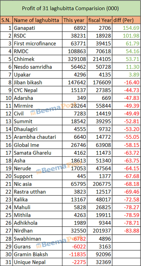 त्यस्तै, फर्स्ट माइक्रोफाइनान्सको ६ करोड ३७ लाख, नेष्डो समृद्ध लघुवित्तको ५ करोड ६४ लाख, आरएसडीसी लघुवित्तको ३ करोड ८२ लाख, निर्धन उत्थान लघुवित्तको ३ करोड २५ लाख, मिर्मिरेको २ करोड ८२ लाख, ग्लोबल आइएमइको २ करोड ६७ लाख, आशाको १ करोड ८६ लाख, समीटको १ करोड ८५ लाख, नेरुडेको १ करोड ७० लाख, सिवाइसी नेपालको १ करोेड ५१ लाख, कालिकाको १ करोड ३१ लाख, सिभिलको ७२ लाख ८३ हजार, गणपतिको ६८ लाख ९२ हजार, आरम्भ चौतारीको ६६ लाख ४० हजार, महुलीको ५८ करोड २८ लाख, धौलागिरीको ४५ लाख ५५ हजार, उपकारको ४२ लाख ९६ हजार, मिथिलाको ४२ लाख ६३ हजार, समता घरेलुको ४१ लाख ६२ हजार, राष्ट्र उत्थानको ३८ लाख २३ हजार, आँधिखोलाको १९ लाख ८९ हजार, सर्पोटको ४ लाख ४५ हजार र आदर्शको ३ लाख ४५ हजार रुपैयाँ खुद नाफा रहेको छ ।