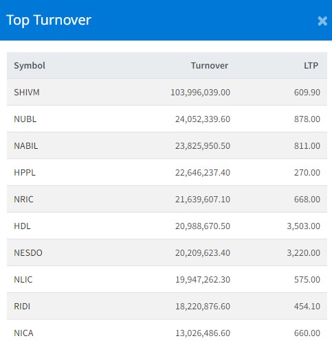 त्यस्तै, निर्धन उत्थान लघुवित्तको २ करोड ४० लाख, नबिल बैंकको २ करोड ३८ लाख, हिमालयन पावर पार्टनरको २ करोड २६ लाख रुपैयाँ र नेपाल पुनर्बीमा कम्पनीको २ करोड १६ लाख रुपैयाँमाथिको कारोबार भएको छ ।