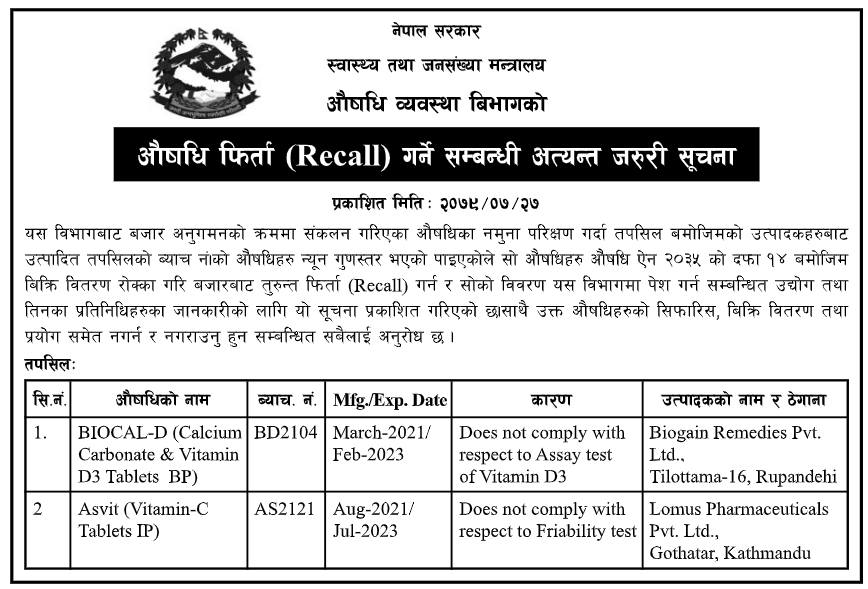 विभागले दुवै औषधीलाई बजारबाट तुरुन्त फिर्ता गर्न कम्पनीहरुलाई निर्देशन दिएको जनाएको छ । साथै सर्वसाधारणलाई सो कम्पनी सम्बद्ध उल्लेखित ब्याच नं का औषधीहरु सेवन नगर्न भनेको छ ।